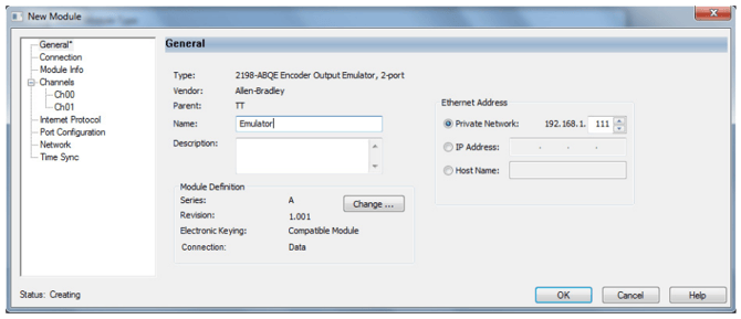 Begin by adding the module to the Ethernet tree. In the General settings, assign a name to the module and configure the Ethernet settings. The 2198-ABQE’s IP address can be set using the rotary switches, then finalized by selecting Private Network in the Ethernet settings.