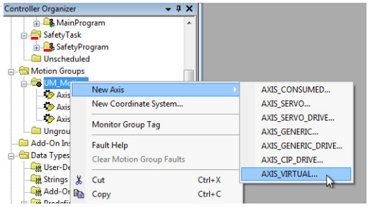 Next, create a virtual axis. You will need one axis per Channel so if you are using both make sure to repeat this step twice. Also, these virtual axes consume a motion device slot. Configure the axis to match your application and add it to the motion group with the input encoder.