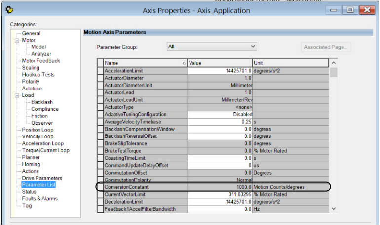 axis, you can find the Conversion Constant in the Parameter List tab of the