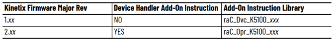 Version 1.xx drives will use the raC_Dvc AIO Library. Version 2.xx will use the raC_Opr library. Both can be found on the Rockwell PCDC. Version 1.xx under the Kinetix 5100 download, version 2.xx is bundled into the Power Device Library. Please follow the appropriate instructions for your drive revision below.