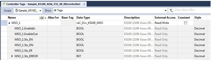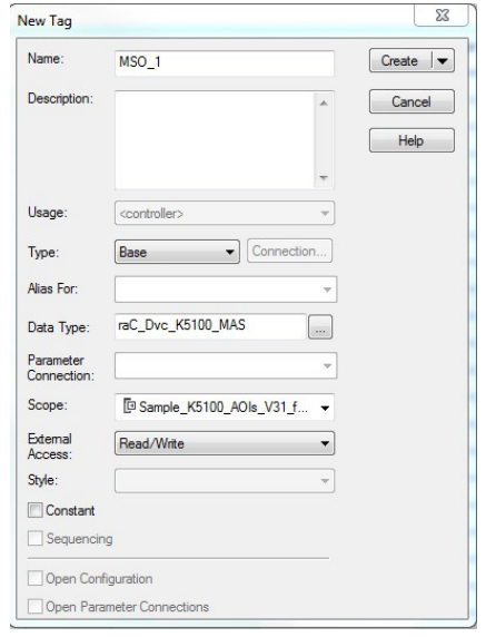 To use this Kinetix 5100 drive Add-On Instruction, you must create a reference tag to reference the appropriate 5100 Device Object. This tag type is raC_UDT_Dvc_K5100_Assm. Follow these steps to