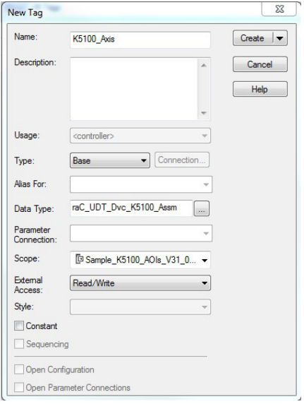 create a Ref_Axis tag. Create a new controller tag and browse for "raC_UDT_Dvc_K5100_Assm" and name it something like "K5100_Axis"