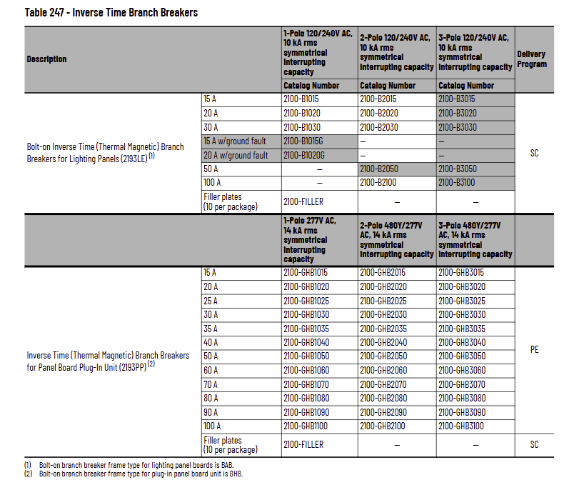 This article provides the part numbers for the circuit breakers used in a 2100 MCC Lighting Panel and Power Panel